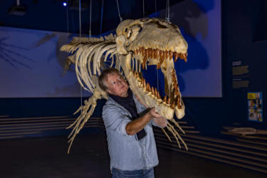 discoverer of the mosasaur, which is now on display as a complete 3D-printed skeleton at the Natural
