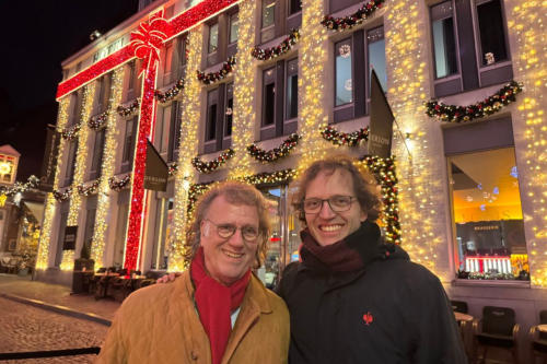 André Rieu and Pierre Rieu posing in front of the fully lit and decorated Hotel Derlon
